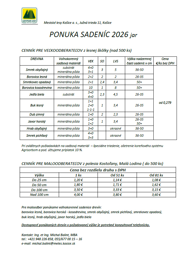 Cenník sadeníc 2026 - jar