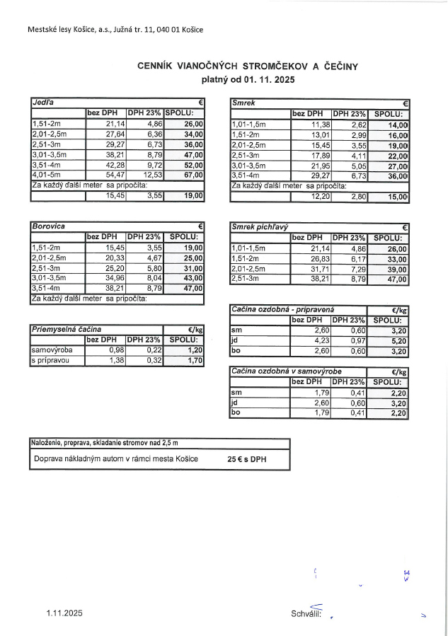 Cenník vianočných stromčekov a čečiny platný od 01.11.2025