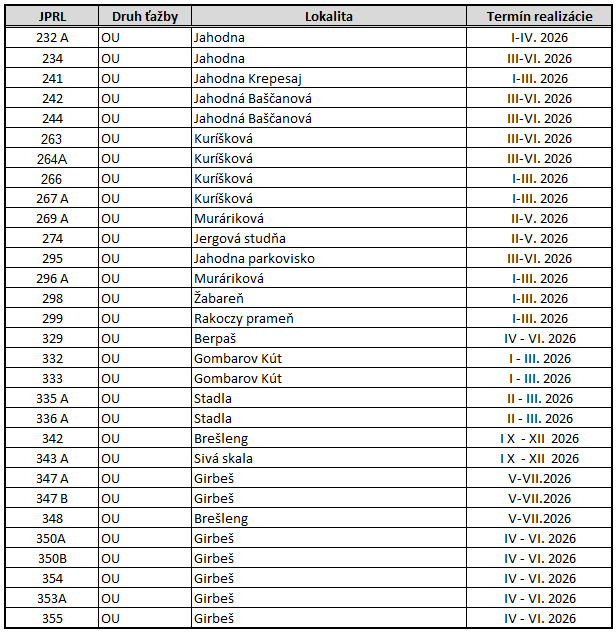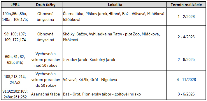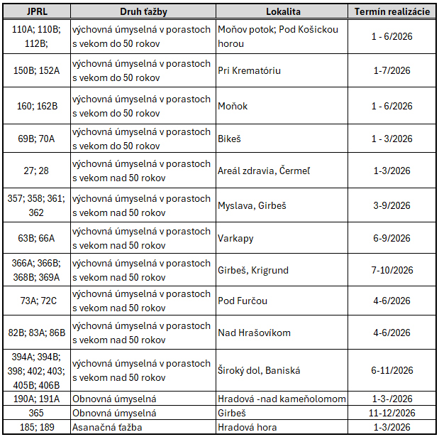 Plánovaná ťažba na území lesoparku - rok 2026 (LC Lesopark, Čermeľ, Jahodná):